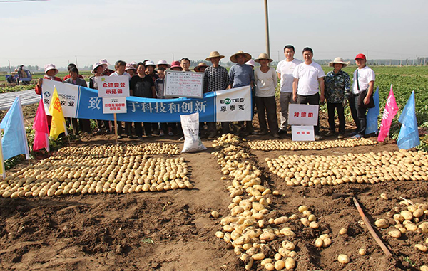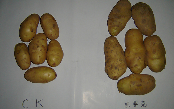 河南鄭州市滎陽高村農(nóng)民黃海望,共種6畝馬鈴薯,其中5畝用的眾德套餐,眾德生物有機肥80公斤,15-10-20高鉀型眾德牌摻混肥100斤在翻地前施用,100斤15-10-20高鉀型眾德牌摻混肥種肥同播,出苗后用態(tài)康科250倍液噴施兩次,另外一畝做對照,同等有機肥,100公斤15-15-15含量的復合肥作底肥。施用眾德牌摻混肥的馬鈴薯莖葉不旺長,發(fā)根早、根粗、苗壯,中期苗高比對照高15-20厘米,長勢好、病害少,收獲時馬鈴薯個頭大、品質(zhì)好、表面光滑,上市早,賣價高,產(chǎn)量比對照高58-60%,畝產(chǎn)達到6100多斤。